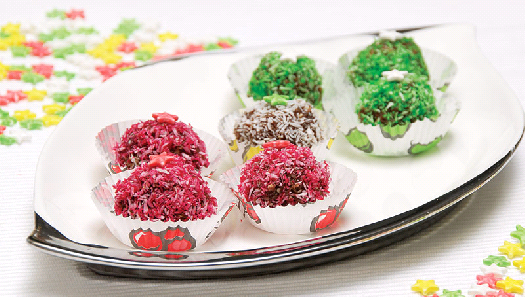 زمانی که مواد خنک شد، به اندازه گردو و یا کوچکتر در دستتان گرد کنید. سپس کاسه های کوچکی شامل زعفران دم کرده خنک شده، پودر کاکائو مخلوط شده با 1 قاشق غذاخوری آب جوش و رنگ های مجاز خوراکی تهیه کنید. توپ های آماده را در رنگ مورد نظر بغلطانید تا رنگ دلخواه شما حاصل شود سپس روی آن از پودر نارگیل که جدا قرار داده بودید بپاشید تا سراسر توپ آغشته به پودر نارگیل شود. به مدت نیم ساعت در یخچال قرار دهید و در ظرف مورد نظر بچینید. با این میزان حدود 18 تا 20 عدد توپ رنگی متوسط به دست می آید. شما می توانید حتی کوچکتر هم گرد کنید تا میزان کالری در هر سرو نیز کاهش یابد.