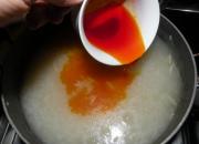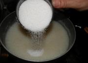 بعد از اینکه دانه برنج کاملا باز شدند، شکر را در نصف لیوان آب جوش حل کنید و به شیر برنج اضافه کنید.